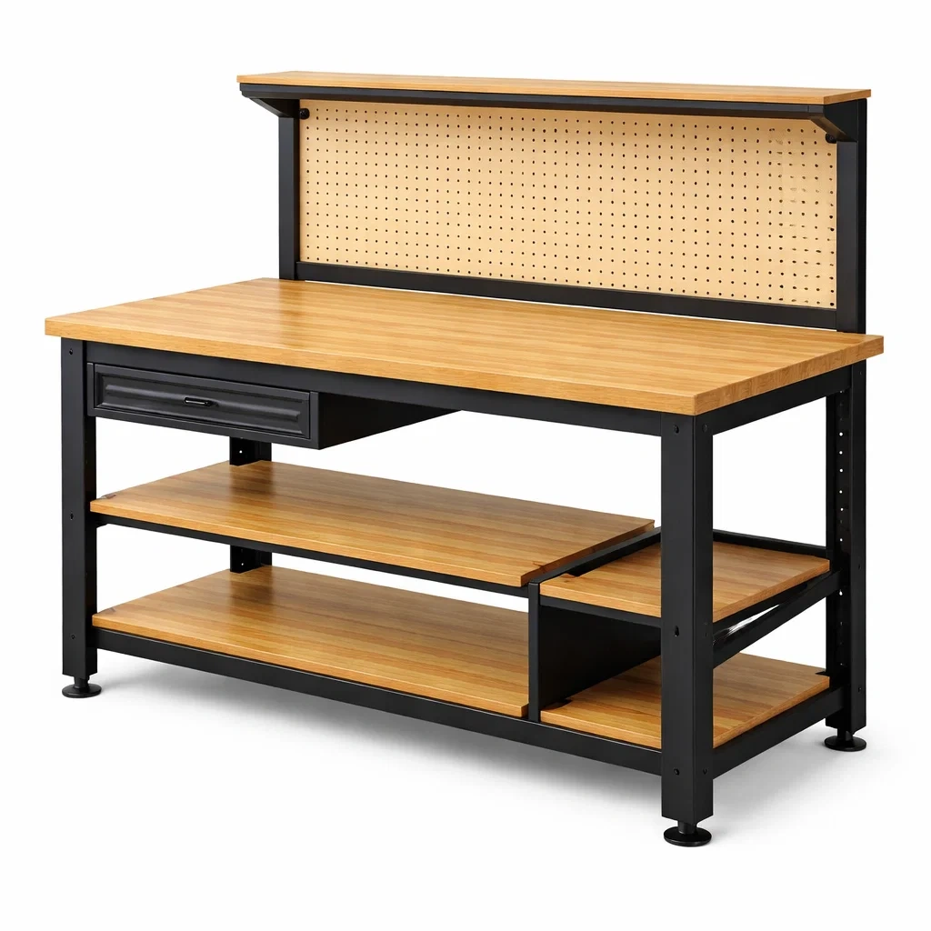 Établi en bois massif et acier avec plusieurs étagères et panneau perforé. Dimensions : longueur 150 cm, largeur 60 cm, hauteur 160 cm. Capacité de charge non spécifiée. Couleur principale : bois naturel, secondaire : noir. Assemblage requis avec matériel inclus. Instructions de montage fournies. Nettoyage à l'aide d'un chiffon humide.