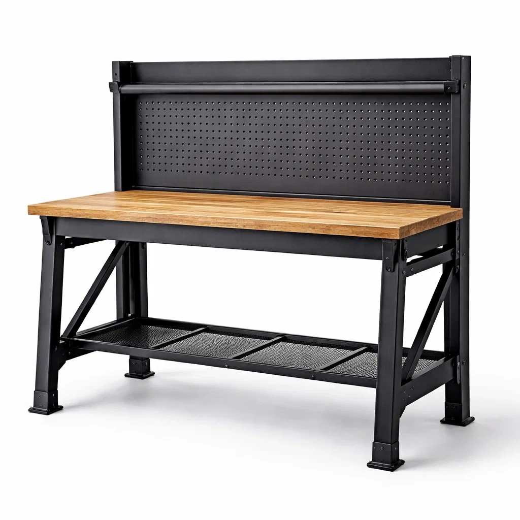 Établi avec cadre en acier et plateau en bois de chêne massif.